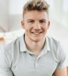 A modern apartment complex featuring two multi-story buildings with large windows and balconies. The complex is surrounded by landscaped areas with palm trees and a small pool in the center. Several parked vehicles are situated along the paved driveway that runs between the buildings.